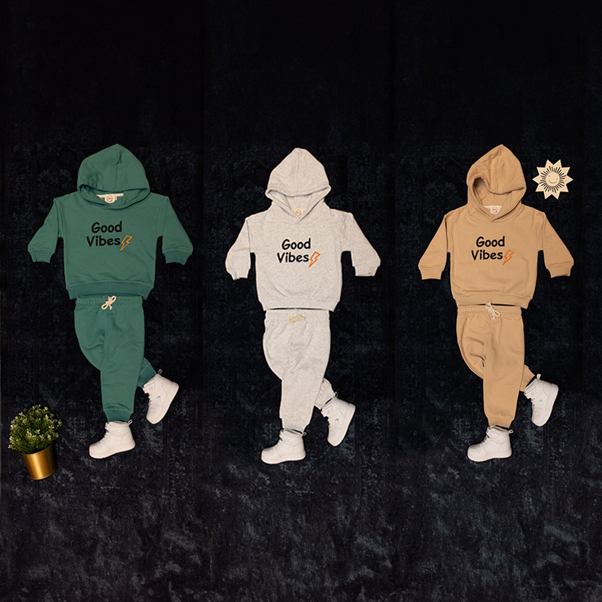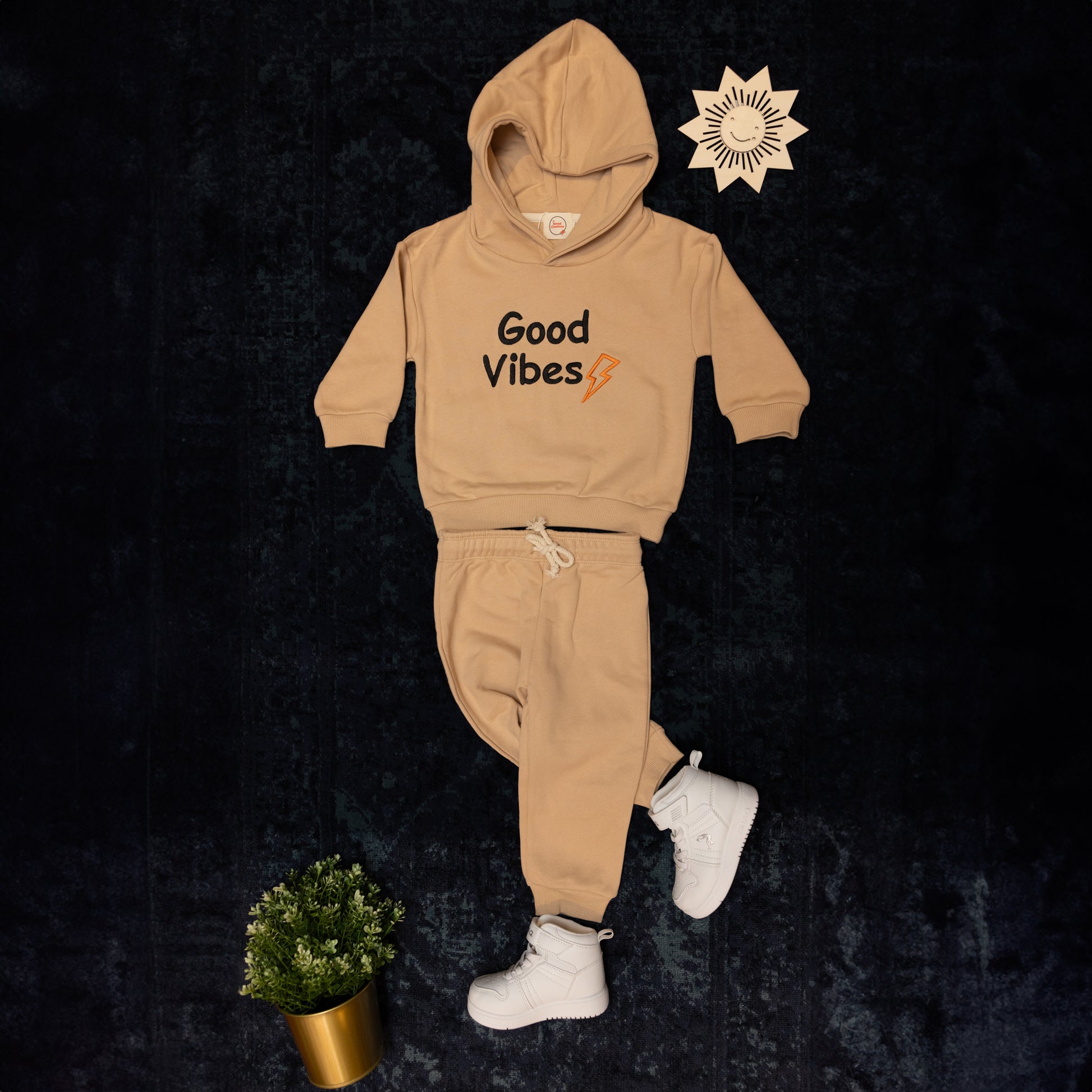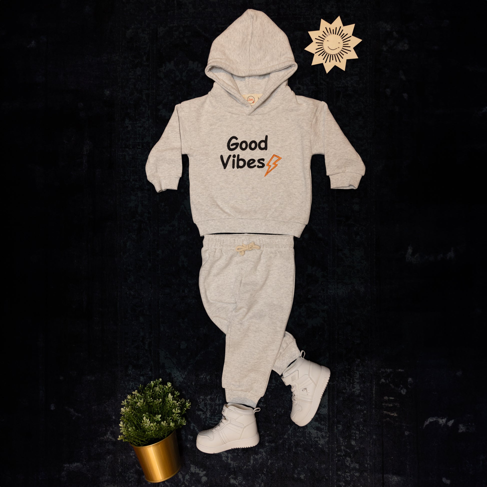 Featuring a powerful message "GOOD VIBES" embroidered on the front of the hoodie, this set serves as a reminder to spread positivity in every situation. Made with high-quality materials for maximum comfort and durability. Let your little one radiate joy and happiness with this trendy and functional outfit.