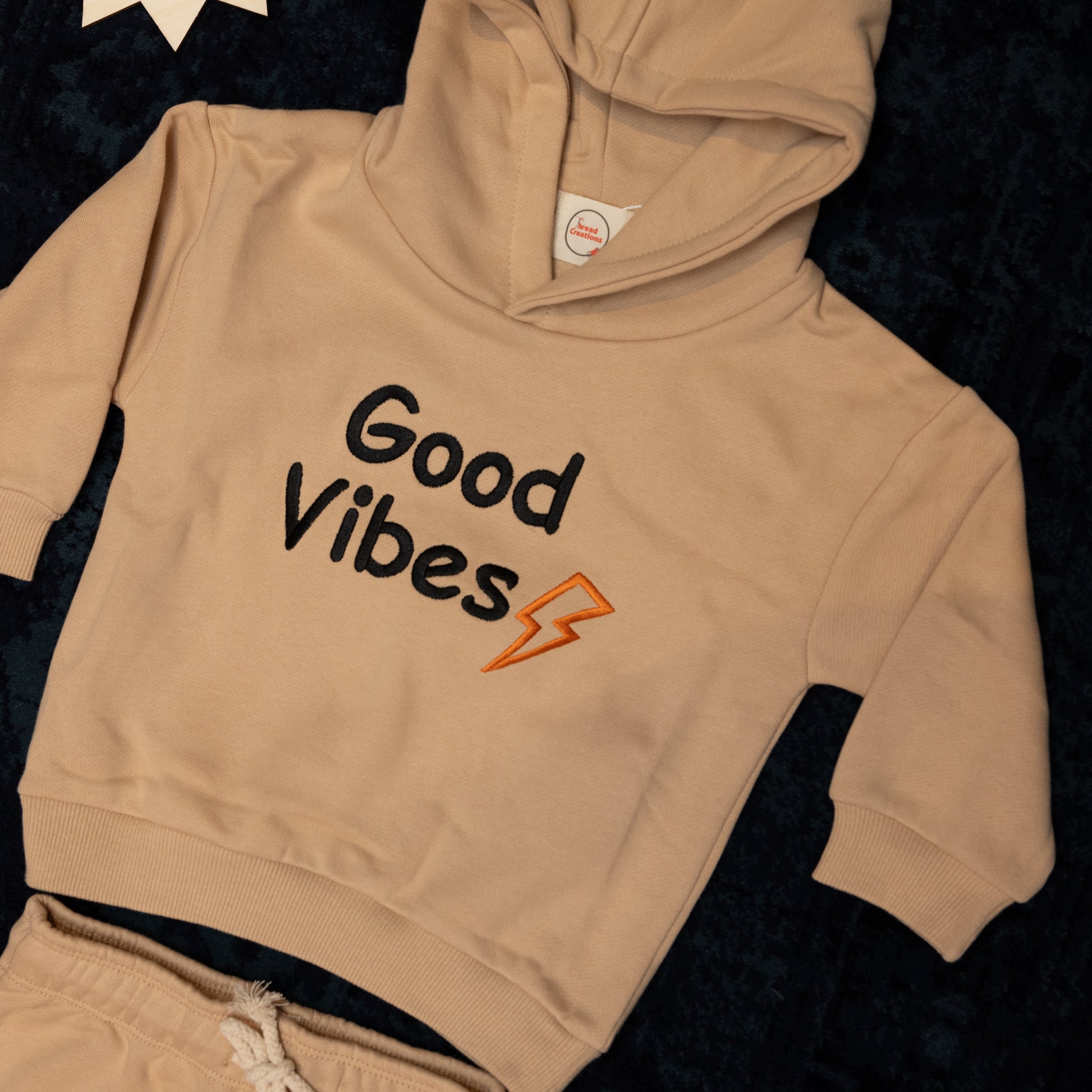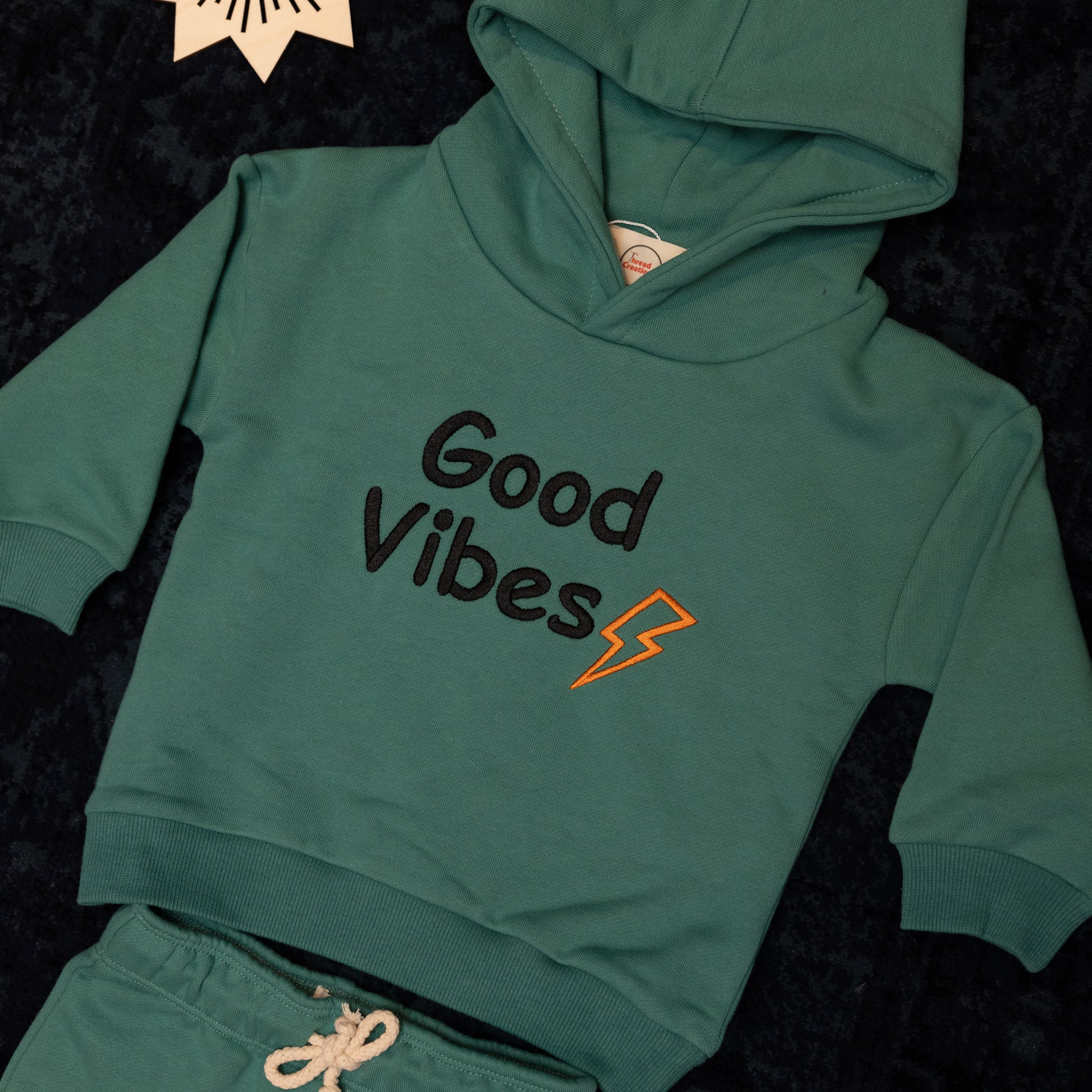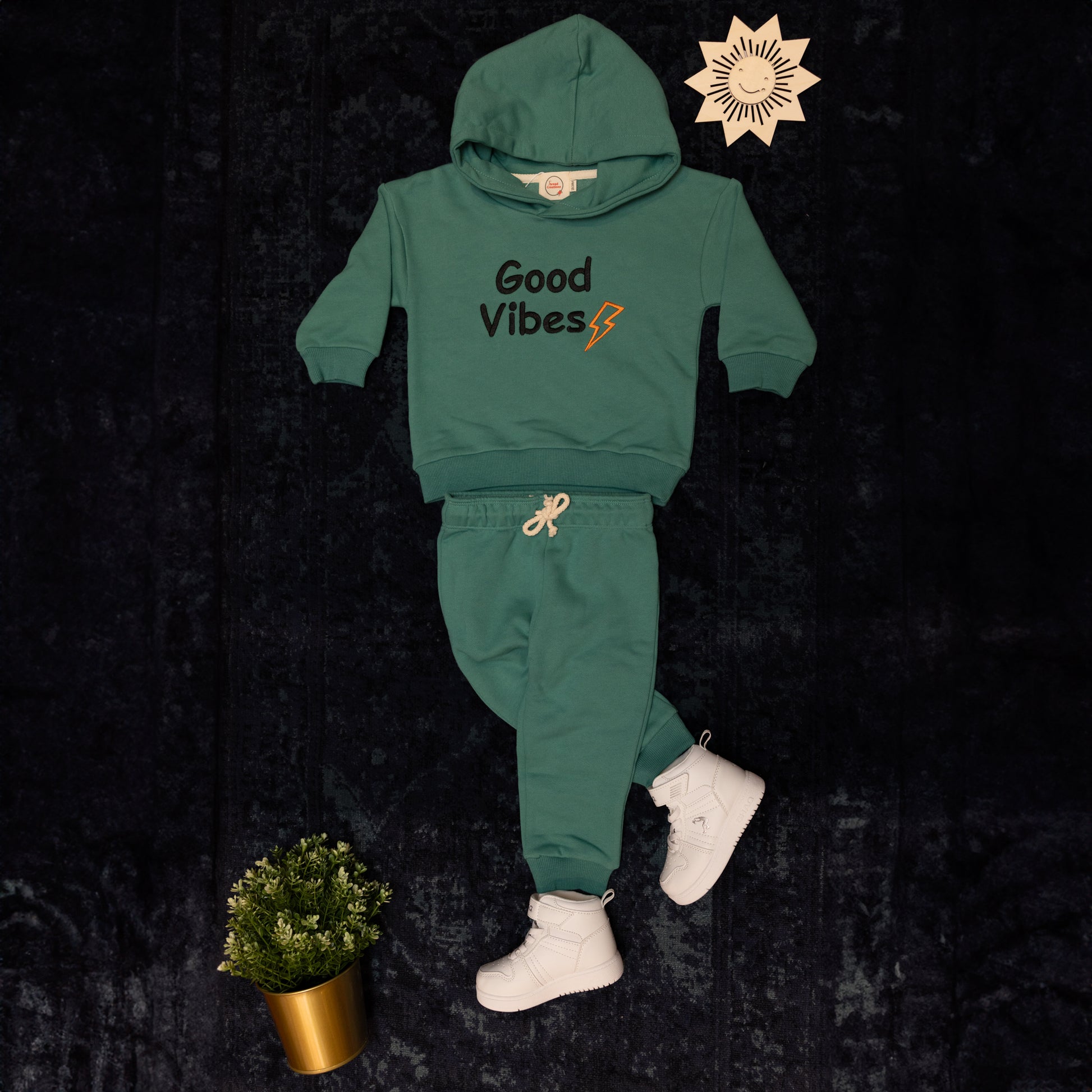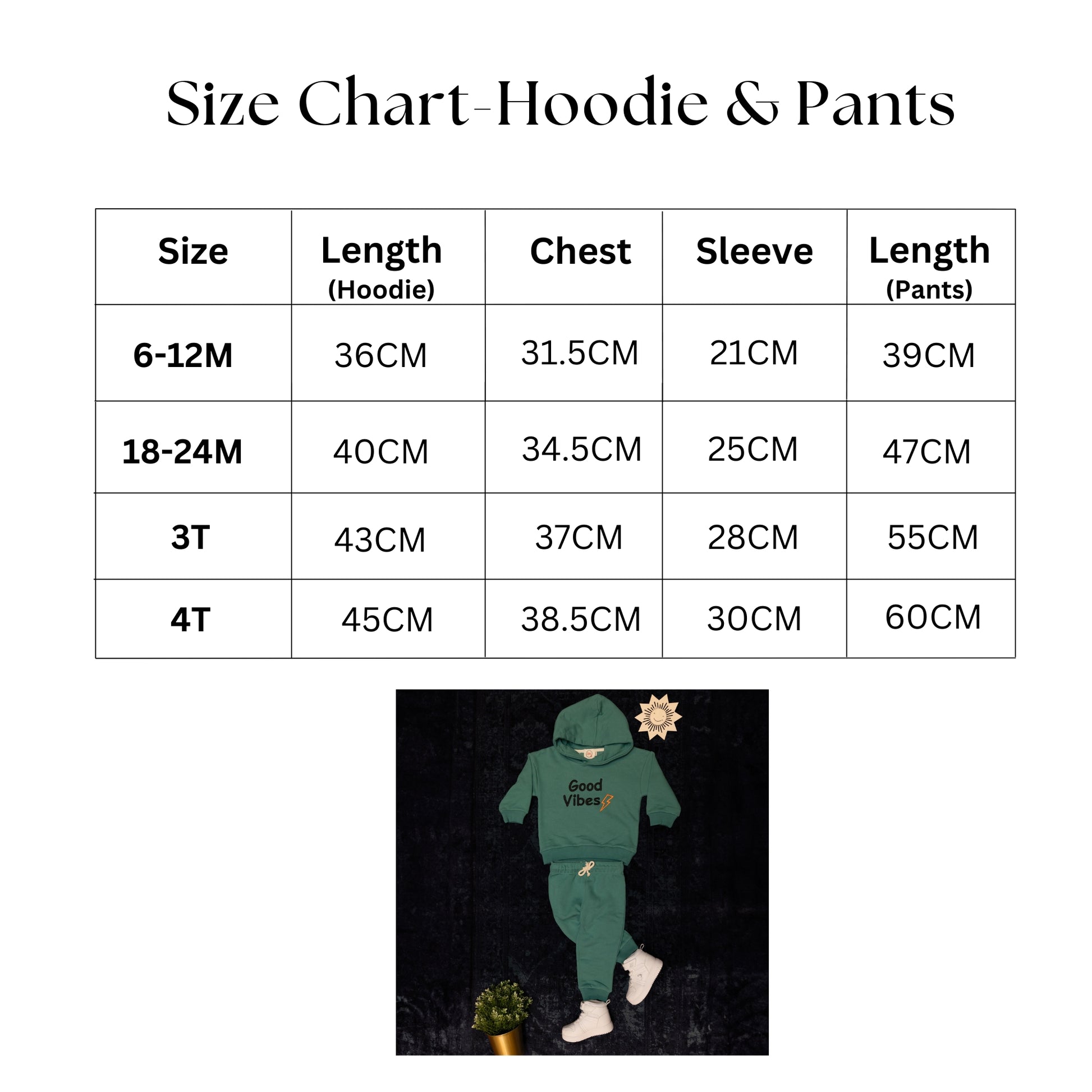 Featuring a powerful message "GOOD VIBES" embroidered on the front of the hoodie, this set serves as a reminder to spread positivity in every situation. Made with high-quality materials for maximum comfort and durability. Let your little one radiate joy and happiness with this trendy and functional outfit.