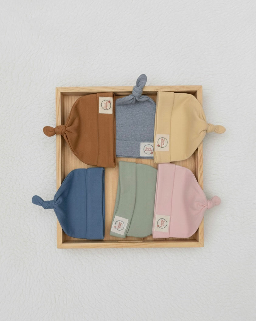 Introducing our Knotted Hats - perfect for keeping your little one cozy and stylish. Made with 100% organic cotton and expertly hand-knotted, these hats provide both warmth and comfort for your baby. Give them the best with our Knotted Hats.