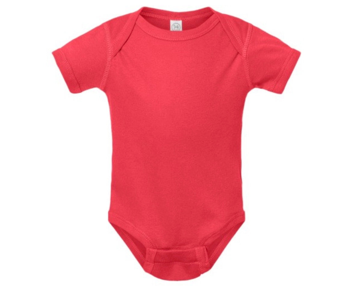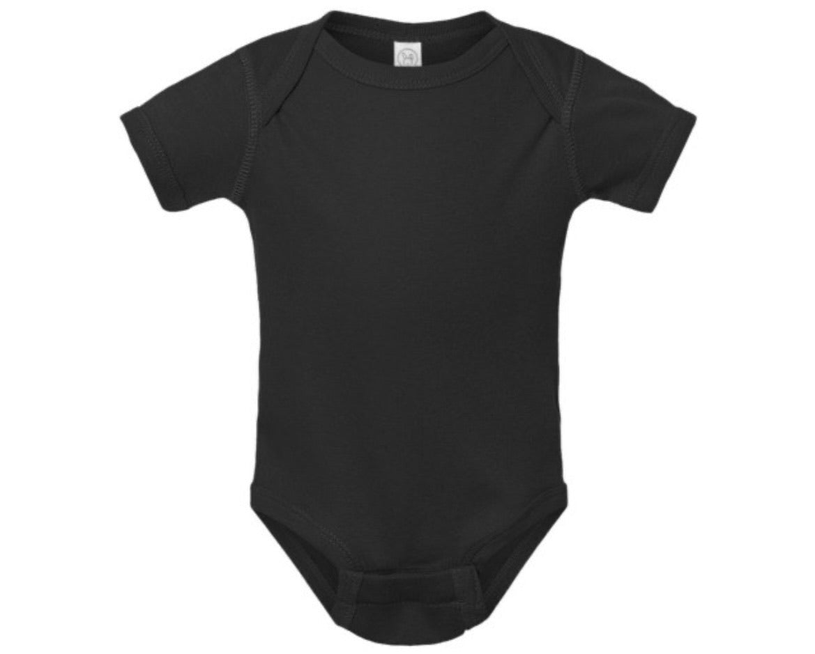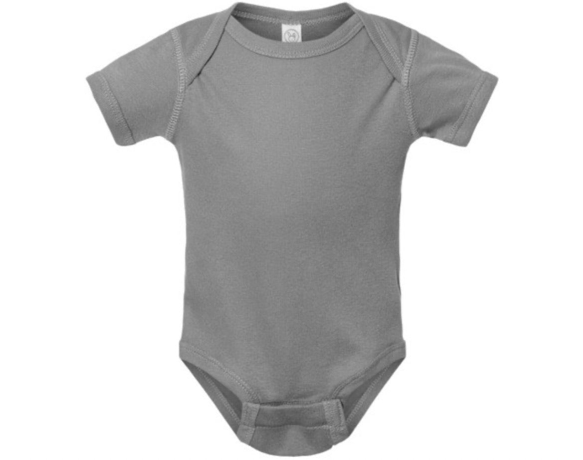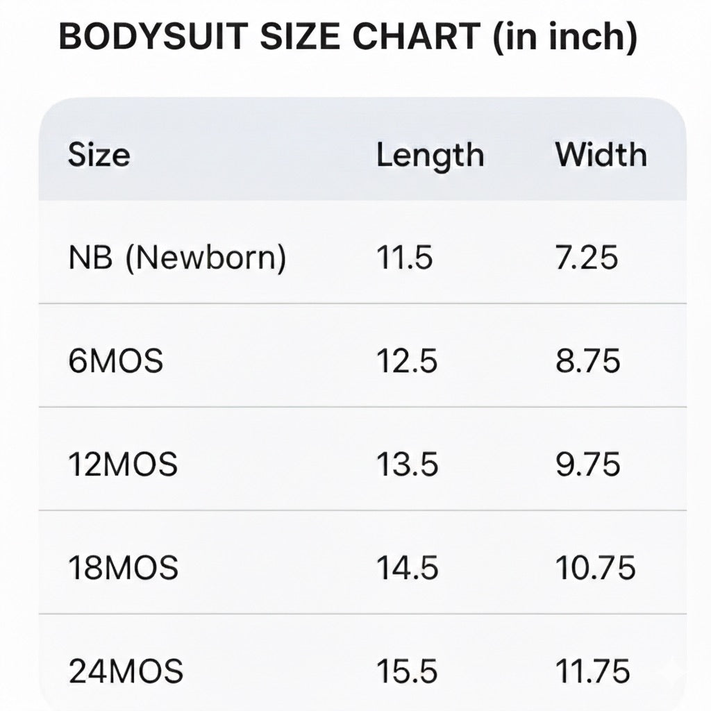 Bodysuit sizes: S (NB), M (6M), L (12M), XL (18M), 2XL (24M)